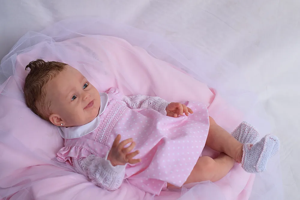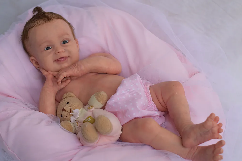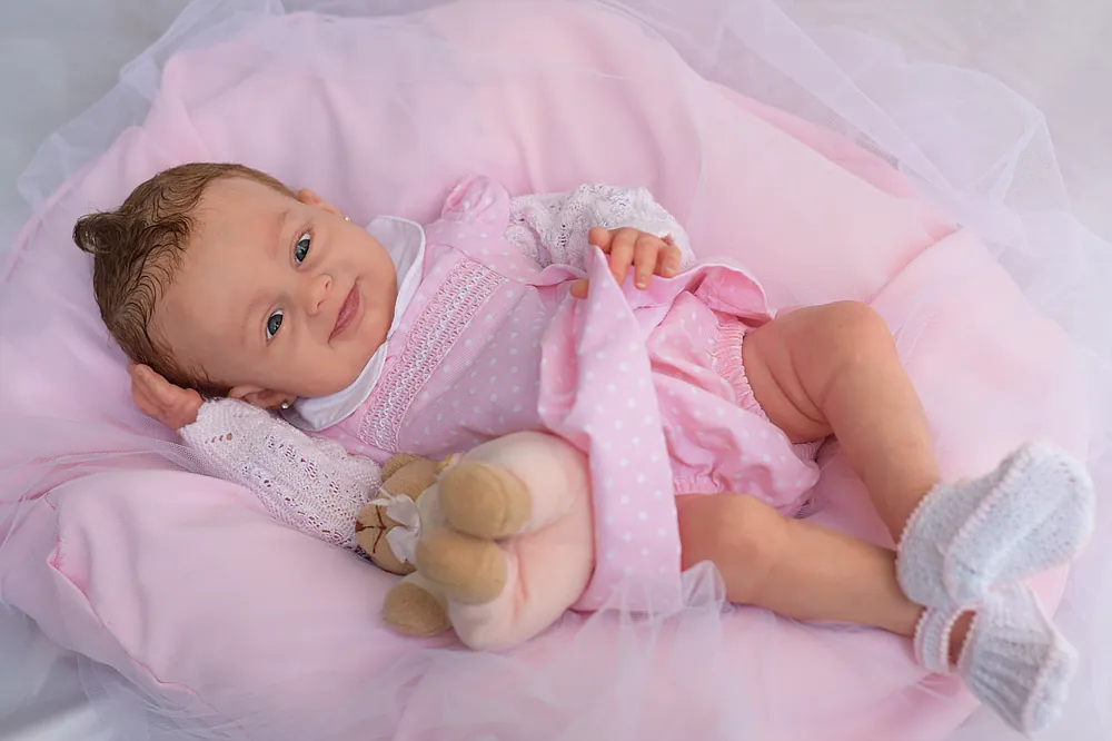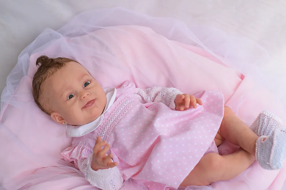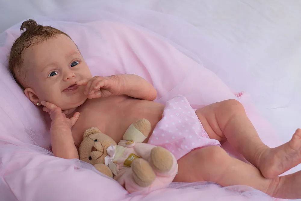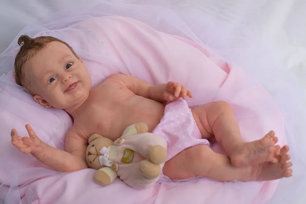 Baby created with Ecoflex 20 and top quality materials. Full silicone body. My babies are all handmade. The realistic complexion of a newborn baby is achieved with Smooth-On Psycho Platinum and Silc-Pig silicone paints, which provide a multi-tonal, translucent skin tone for total realism. All of my babies have beautiful newborn skin tones and feature the softest mottling, veining and tiny spots that are added for incredible realism. My painting method ensures exceptional skin depth that is guaranteed to amaze. My babies are airbrushed with silicone paints to keep their skin perfectly smooth, and finally receive a healthy satin finish for realism. They can be bathed just like a real newborn would. Open mouth with sculpted tongue and gums. Can take a pacifier and bottle.