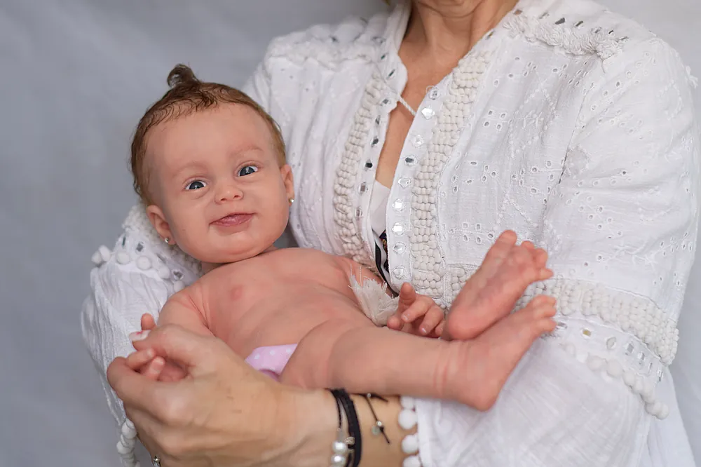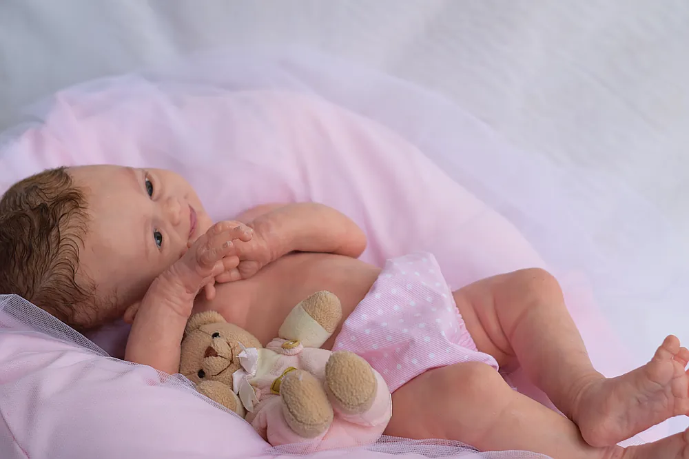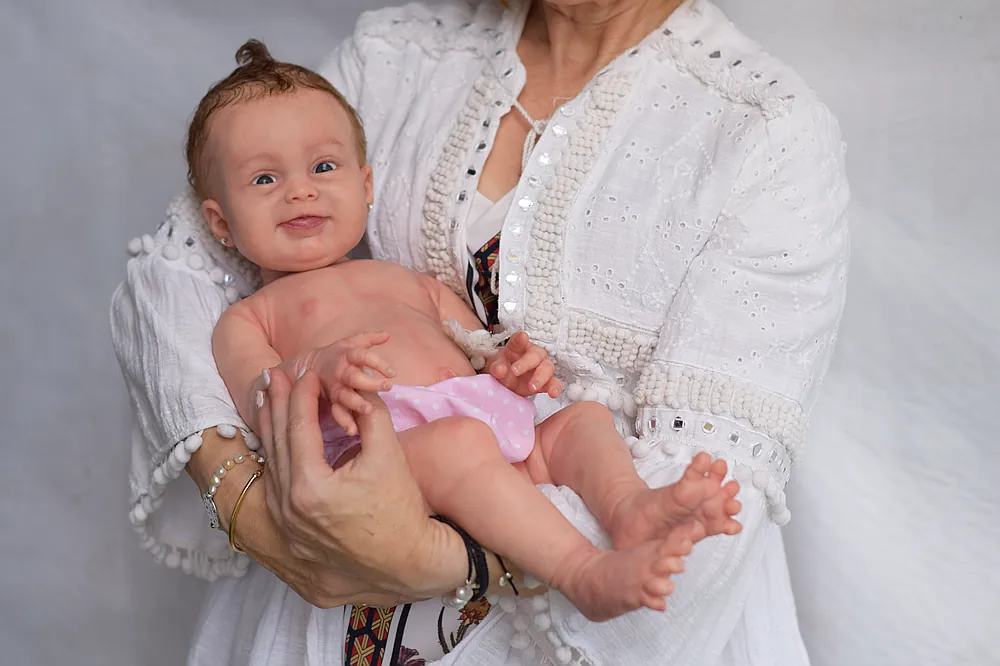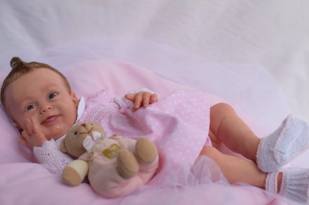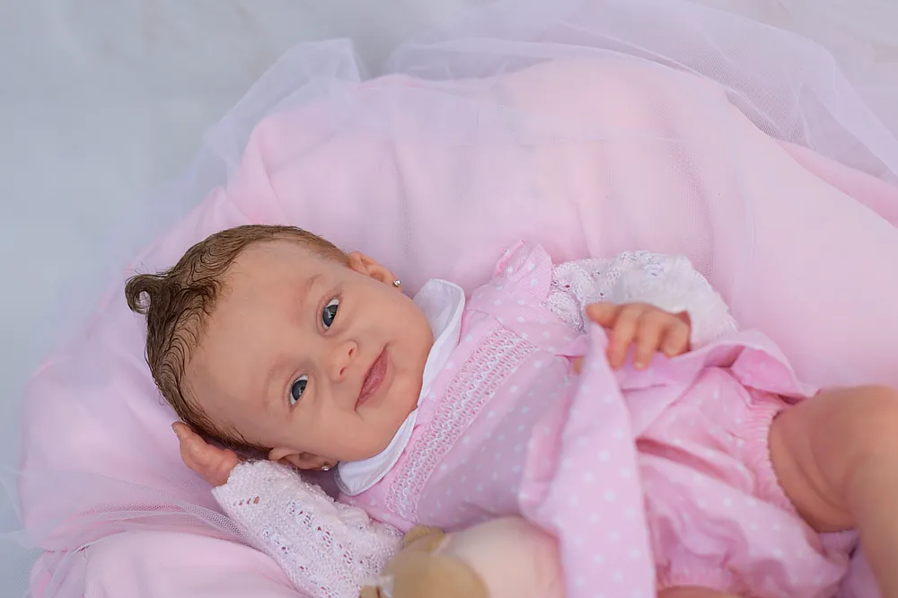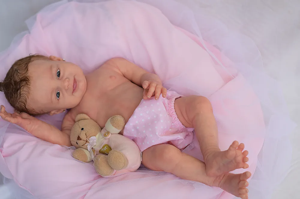 Baby created with Ecoflex 20 and top quality materials. Full silicone body. My babies are all handmade. The realistic complexion of a newborn baby is achieved with Smooth-On Psycho Platinum and Silc-Pig silicone paints, which provide a multi-tonal, translucent skin tone for total realism. All of my babies have beautiful newborn skin tones and feature the softest mottling, veining and tiny spots that are added for incredible realism. My painting method ensures exceptional skin depth that is guaranteed to amaze. My babies are airbrushed with silicone paints to keep their skin perfectly smooth, and finally receive a healthy satin finish for realism. They can be bathed just like a real newborn would. Open mouth with sculpted tongue and gums. Can take a pacifier and bottle.