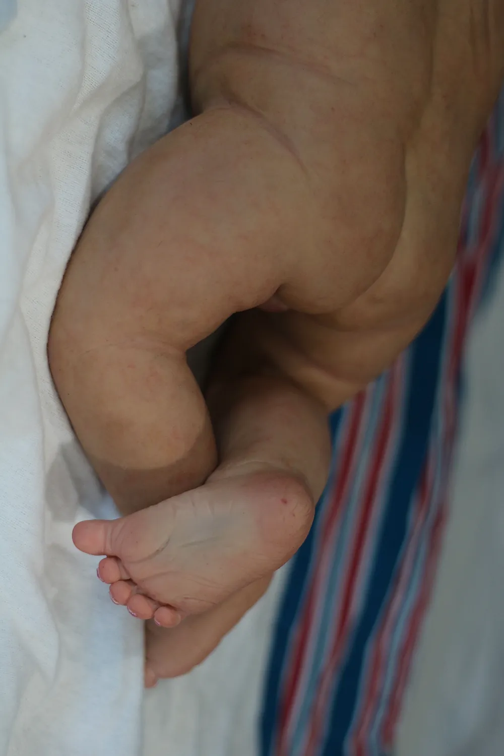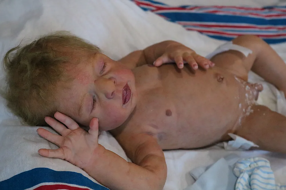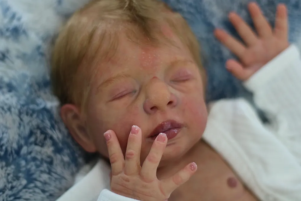 This hyper realistic full body silicone boy is made from the Emanuel sculpt by Laurie Sullivan Roy. He is painted with so much detail including baby scratches and dry skin effects. His nails are extended and painted very detailed and lifelike. He is extremely realistic in person. He has a tongue that I added with a lingual frenulum. He has lanugo and capillaries and veins. He is an amazing baby from head right down to the poke in his heel. He wears size newborn and can also fit 0-3 months. He will come home with a box opening and packaged in a special keepsake box. He is available now and his adoption fees include any tariffs that may be charged if shipped to 🇺🇸. The tariffs are covered by me at the time of shipping.
