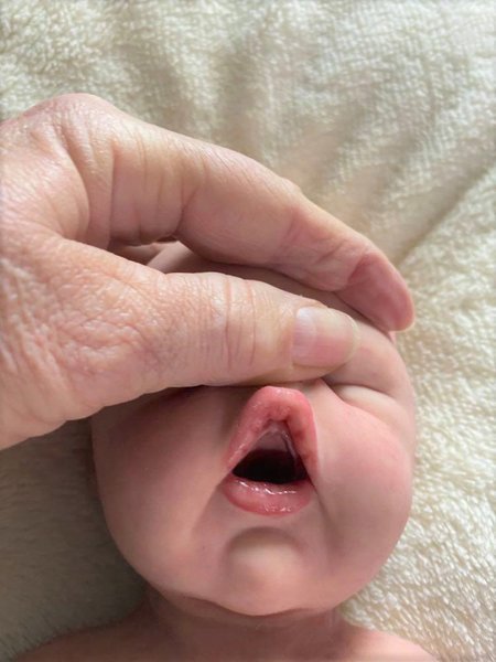 She has an open mouth with gums & tongue and can take a preemie paci.