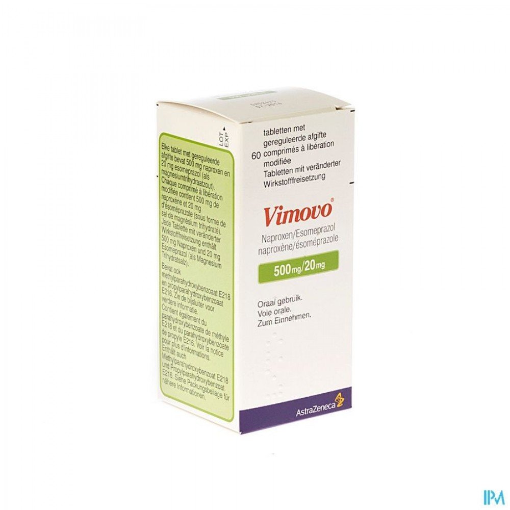 Vimovo 500mg/20mg Modified Release Tablets are specially formulated to provide effective relief from pain and inflammation. Combining the power of naproxen, a nonsteroidal anti-inflammatory drug (NSAID), with esomeprazole, a proton pump inhibitor, these tablets are designed for individuals who need to manage conditions such as osteoarthritis, rheumatoid arthritis, and ankylosing spondylitis. Experience the dual action of Vimovo, which helps reduce your pain while protecting your stomach from the potential side effects of NSAIDs.